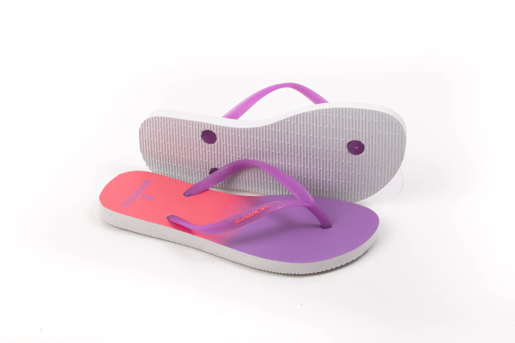 Solado 100% borracha, correia em PVC, logo pintado em serigrafia, estampa feita em técnica de transfer.