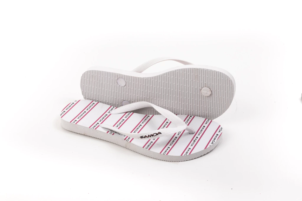 Solado 100% borracha, correia em PVC, logo pintado em serigrafia, estampa silkada em serigrafia.