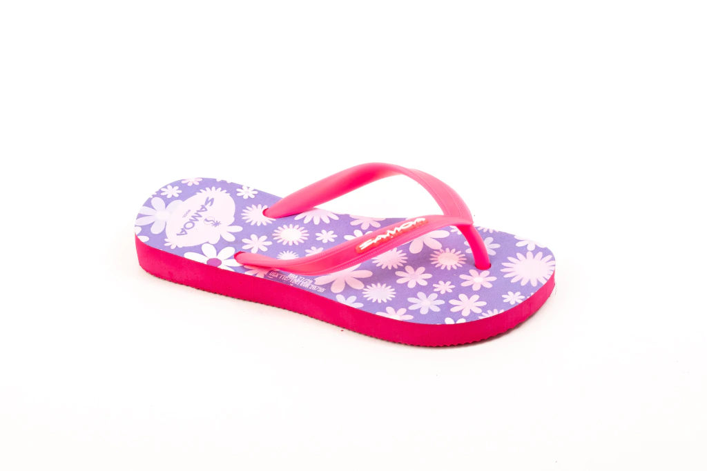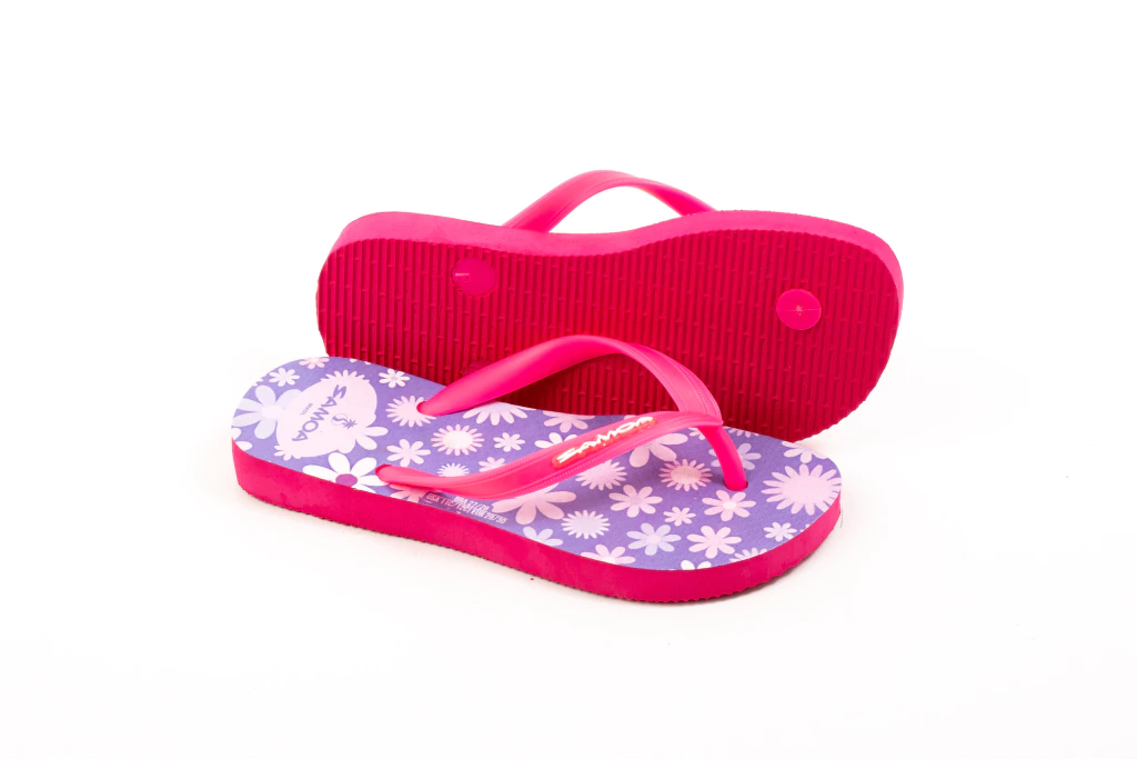 Solado 100% borracha, correia em PVC, logo pintado em serigrafia, estampa feita em técnica de transfer.