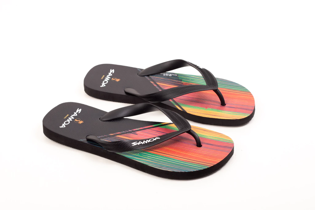 Solado 100% borracha, correia em PVC, logo pintado em serigrafia, estampa feita em técnica de transfer.