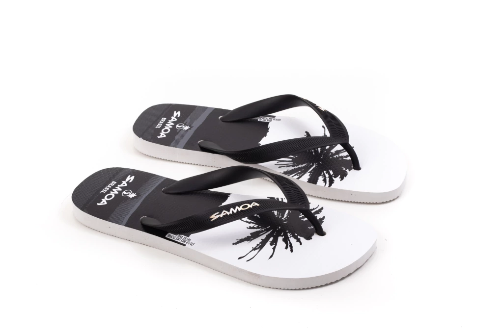 Solado 100% borracha, correia em PVC, logo pintado em serigrafia, estampa feita em técnica de transfer.