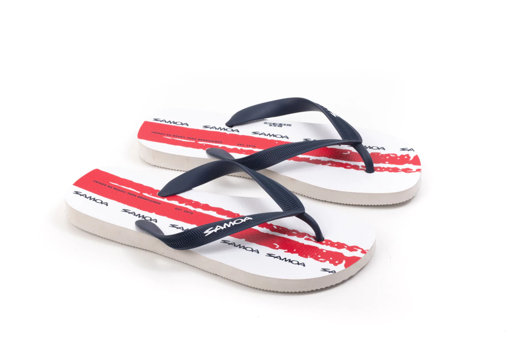Solado 100% borracha, correia em PVC, logo pintado em serigrafia, estampa silkada em serigrafia.