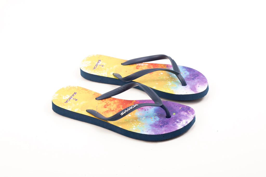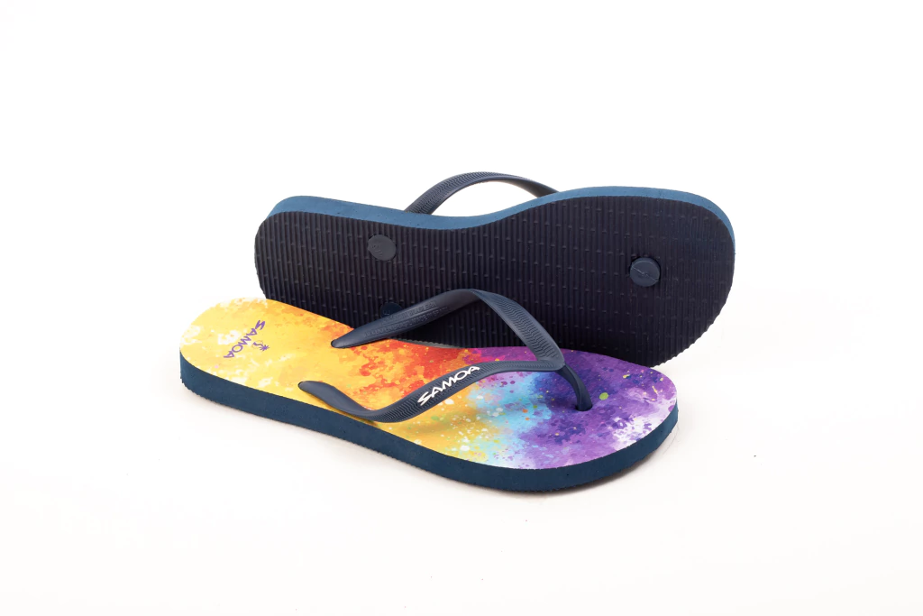 Solado 100% borracha, correia em PVC, logo pintado em serigrafia, estampa feita em técnica de transfer.