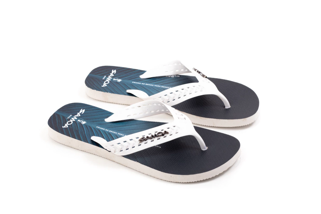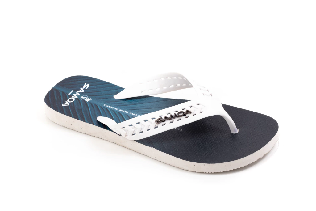 Solado 100% borracha, correia em PVC, logo pintado em metal, estampa feita em técnica de transfer.